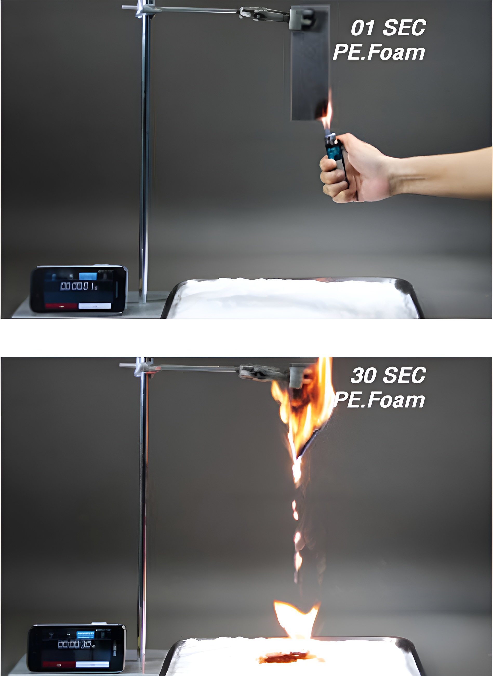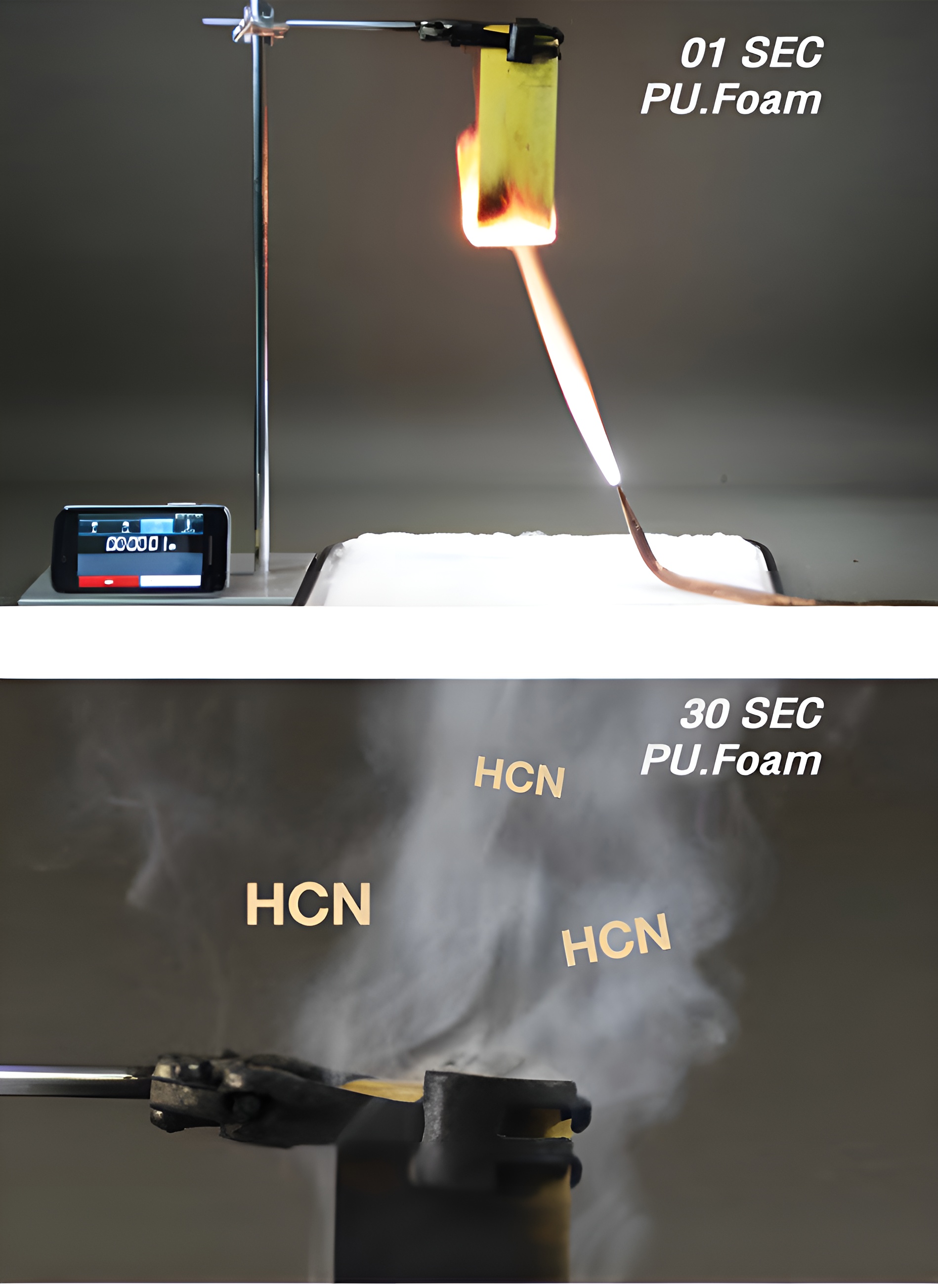 ฉนวน (PU/PE Foam) เป็นฉนวนที่มีโครงสร้างเซลชนิดกึ่งเปิดกึ่งปิด (Semi Open Cell) ทำให้มีค่าการดูดซึมน้ำและความชื้นสูง ฉนวน PE Foam เป็นวัสดุที่ทำจาก Thermoplastic ทำให้เมื่อถูกความร้อนหรือเปลวไฟจะหลอมละลายกลายเป็นหยดไฟ ส่วนฉนวน PU Foam หากเกิดเพลิงไหม้จะมีควันมากและเป็นก๊าซไฮโดรเจนไซยาไนต์ที่ทำให้ผู้อยู่อาศัย เสียชีวิตโดยเฉียบพลัน